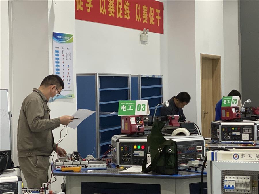 公司選派兩名員工參加本次大賽的電工項目及電氣安裝項目比賽,比賽通過理論知識考試和現(xiàn)場實操考試形式進行,現(xiàn)場實操考試以機電設(shè)備事故處理的形式開展。比賽要求參賽選手在規(guī)定時間內(nèi)完成相同的任務(wù),速度快、操作準、質(zhì)量高者獲勝。
