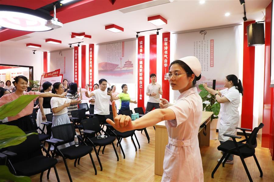 隨后,蔣芳幸醫(yī)生現(xiàn)場示范八段錦經(jīng)典動作,逐一講解要領(lǐng)及養(yǎng)生功效。職工們跟隨練習(xí),在醫(yī)生指導(dǎo)下逐漸掌握動作規(guī)范,切身感受傳統(tǒng)功法的養(yǎng)生魅力。